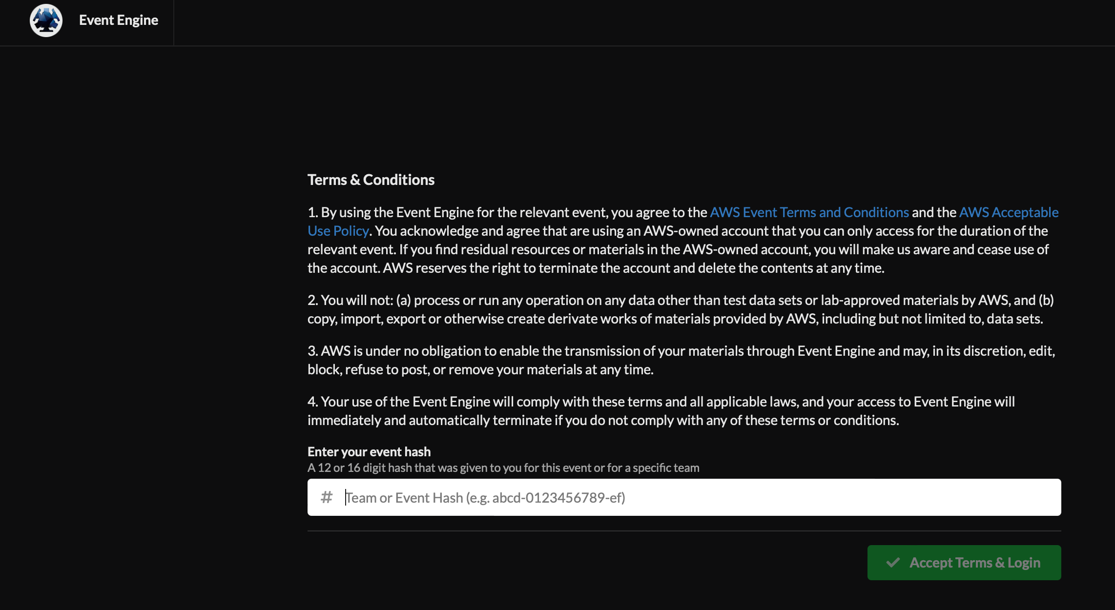 # Workshop Execution Steps ## Set up AWS Accounts 1 If you are running the workshop **on your own** and you don’t already have an AWS account with Administrator access, please create one now by clicking here (https://aws.amazon.com/getting-started/). 2 If you are running the workshop **at an AWS Event or with AWS teams**, Login to AWS Workshop Portal by clicking the button or browsing to https://dashboard.eventengine.run/ The following screen shows up.